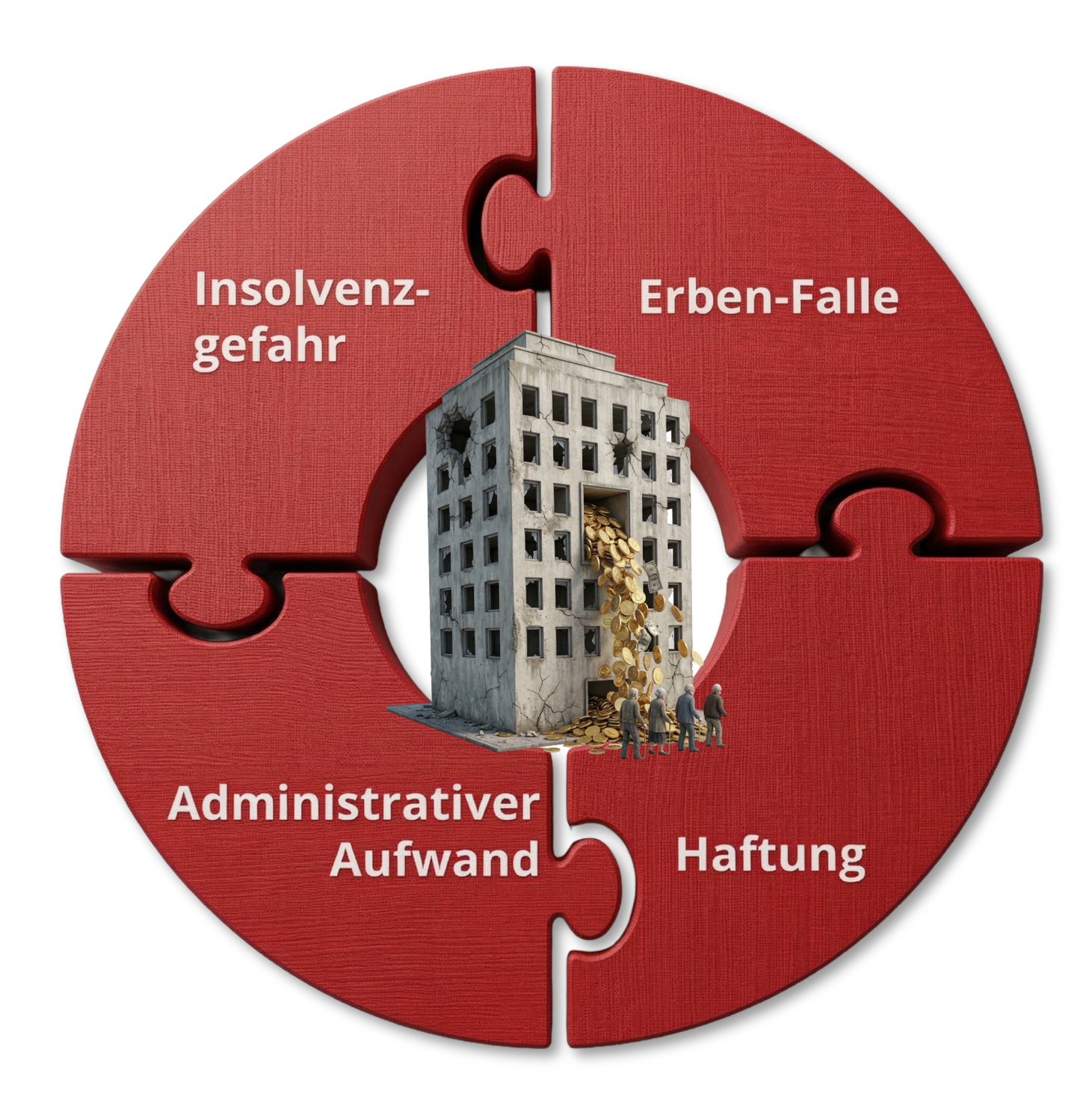 Die Lebenserwartung ist schwer kalkulierbar, der Kapitalbedarf steigt und Verwaltungskosten bleiben bestehen. Sinkt das Kapital unter die Pensionsrückstellungen, drohen bilanzielle Überschuldung und Insolvenzauslöser – mit persönlichen Haftungsrisiken für Geschäftsleitung und ggf. Berater.
